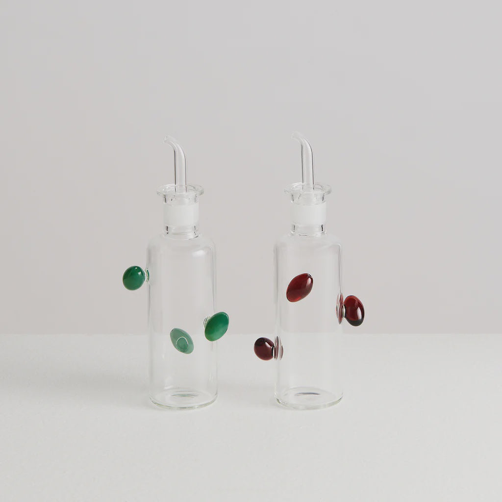 This charming duo includes one Mini Olive Bottle and one Balsamic Vinegar Bottle — two hand-blown glass vessels adorned with cheeky olives and playful grapes, ready to hold the most crucial ingredients for a perfect French vinaigrette.