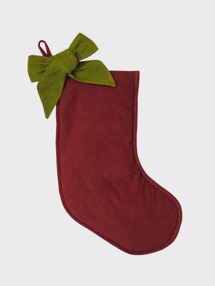 Add a fresh twist to your festive styling with the Ruby/Peach Corduroy Stocking. This reversible design features rich ruby red on one side and a soft peach on the reverse. The detachable olive green bow clip can be attached on either side or not at all, depending on your mood and aesthetic.