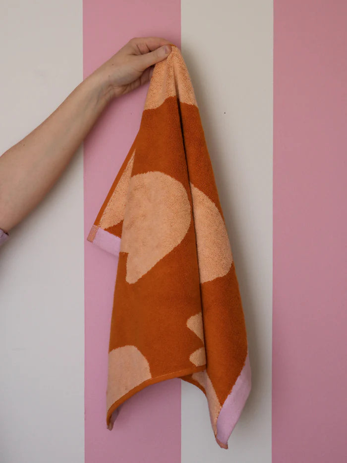 Introducing Mosey Me's Tulip Hand Towel. The stunning Tulip graphic in orange and cream creates a striking design that is perfect for your self-care space.