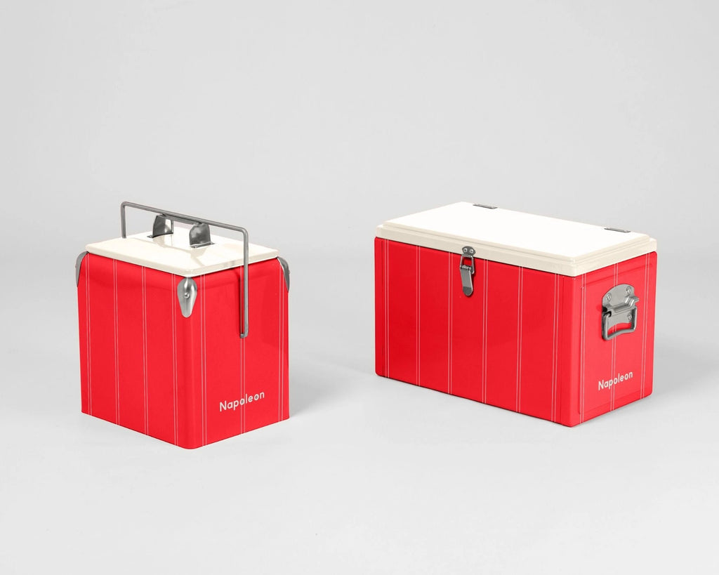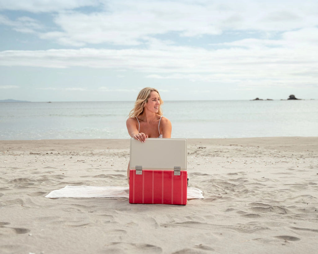 Napolena's Twin Stripe Chilly Bin in Cherry Red boasts a vibrant, classic colour palette - punchy cherry red with cream accents. The twin stripe design coupled with the contrasting cream lid give just the right amount of preppiness, and a little hint of retro.