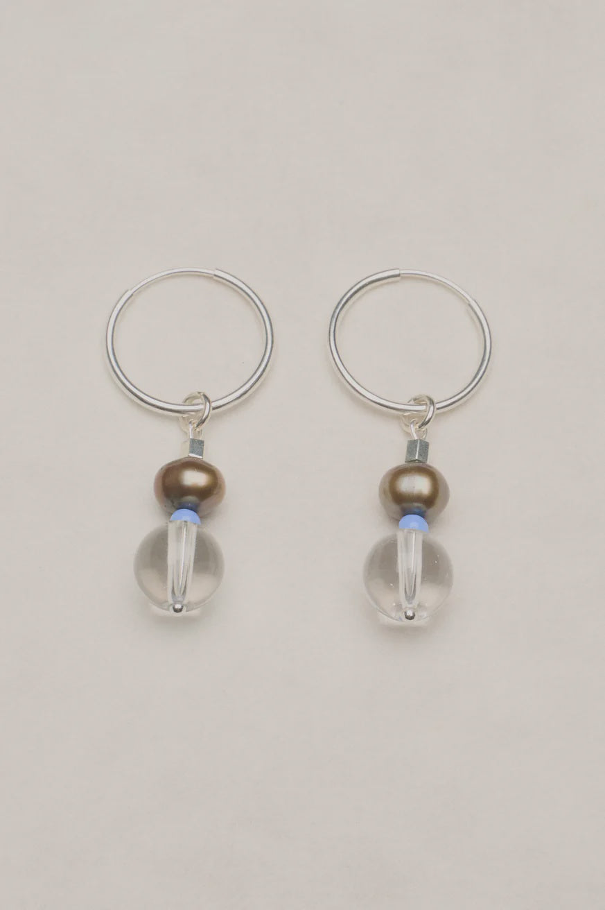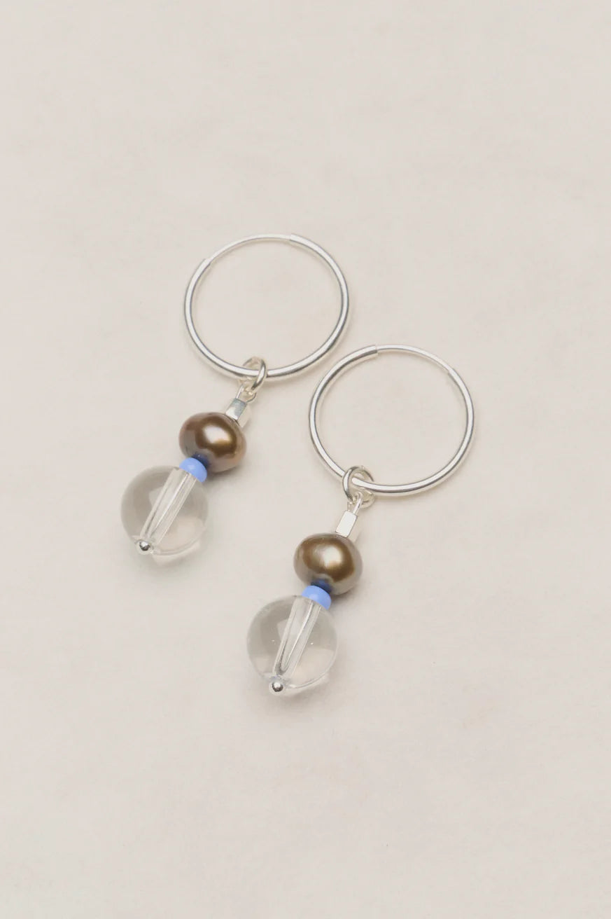 Sterling Silver Sleeper Hoops featuring luminous Freshwater Pearls, Crystal Quartz & a Powder Blue glass bead.