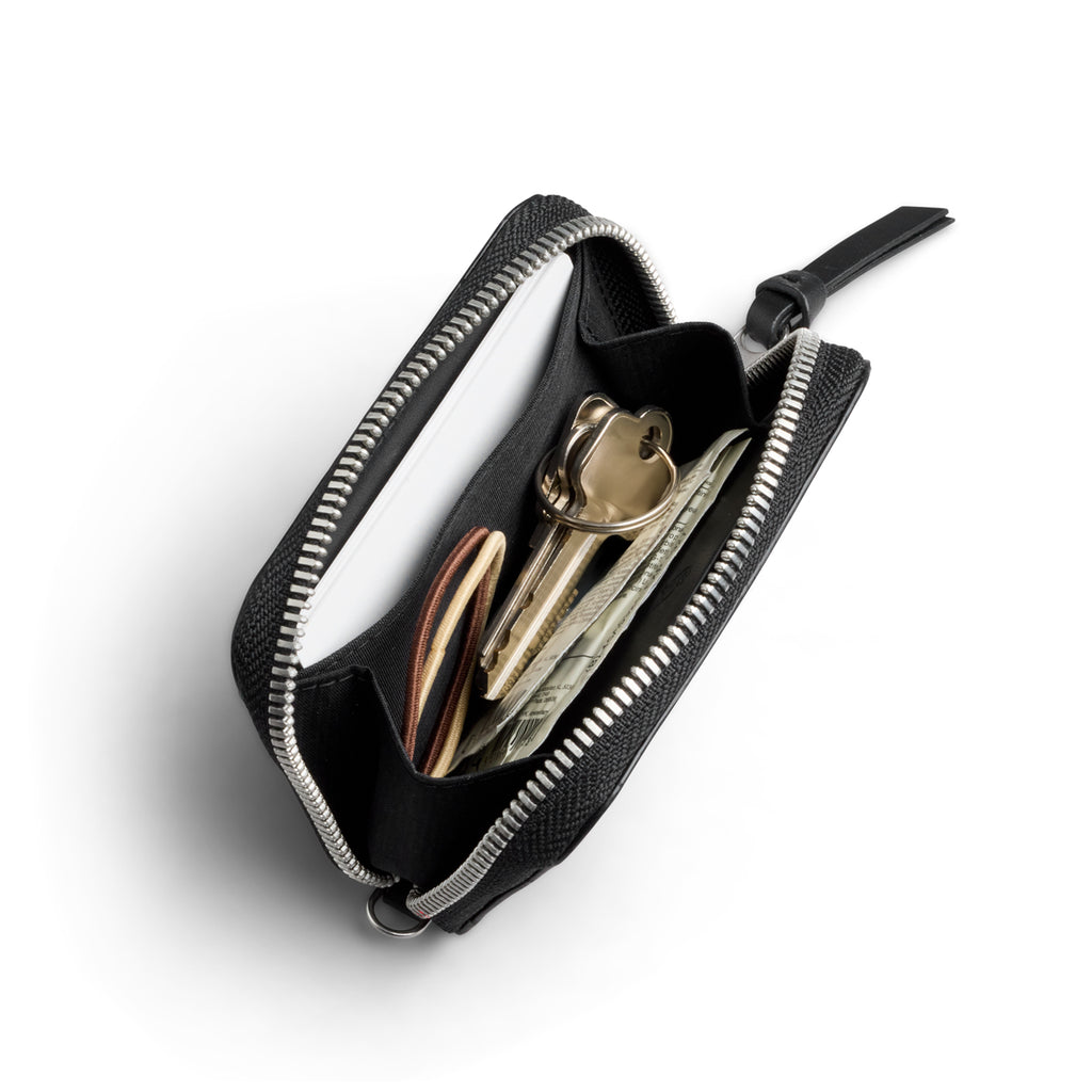Unexpected storage in a mini wallet, with space for cards and coins – plus keys and other extras – and the security of a zip.
