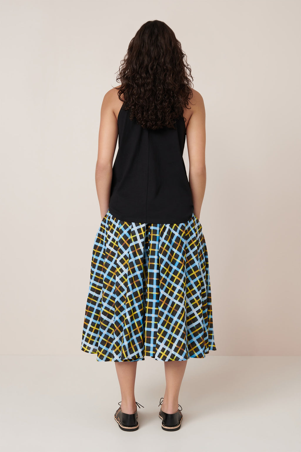 Defined by its voluminous gathers, the Motion Skirt has a relaxed fit that sits high rise with a comfortable elastic waistband. Finshed with practical side seam pockets, it falls to a flattering ankle length. Crafted from light-weight organic cotton voile in our Neon tartan print — an edgy handpainted design with bold brushstrokes and vibrant pops of fluroscent yellow. All Fairtrade organic cotton. All plastic-free.
