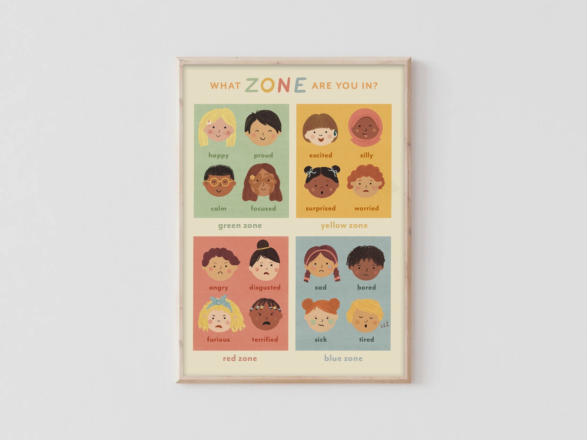 This engaging art print makes it easier for young ones to recognise and understand their feelings, featuring the four Zones of Regulation. Each colorful zone includes illustrations of diverse children showing a range of labelled emotions, while the handwritten question, "What zone are you in?" invites self-reflection and encourages meaningful conversations about emotions.